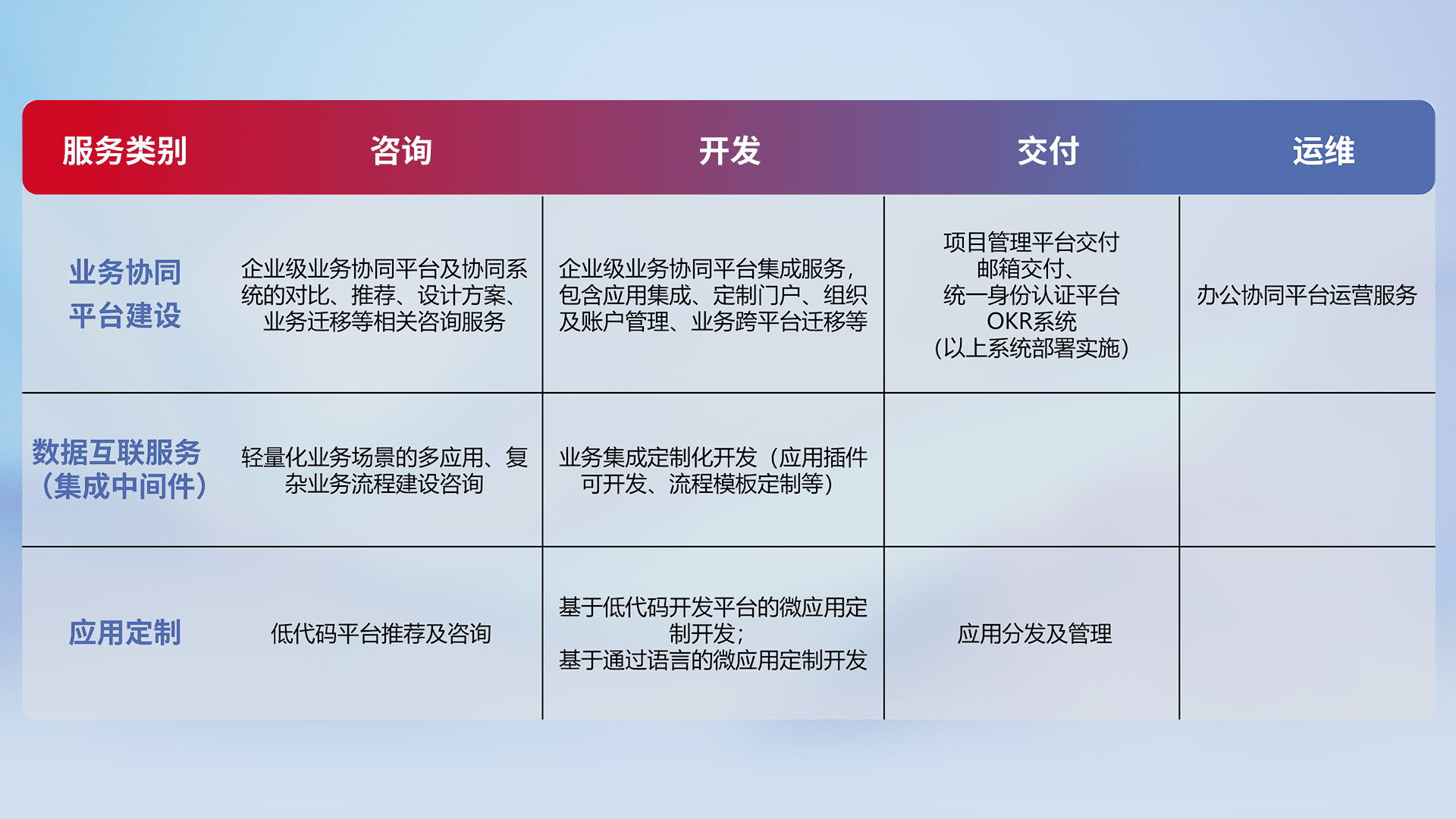 针对钉钉、、企微、、、IDaas等平台级产品提供产品的规划、、、、方案、、交付、、、、定制化开发等服务,,实现如统一协同办公、、、智能客户服务、、、、混合会议管理、、、、智能数据查询、、等业务场景,,,实现数字化转型。。。