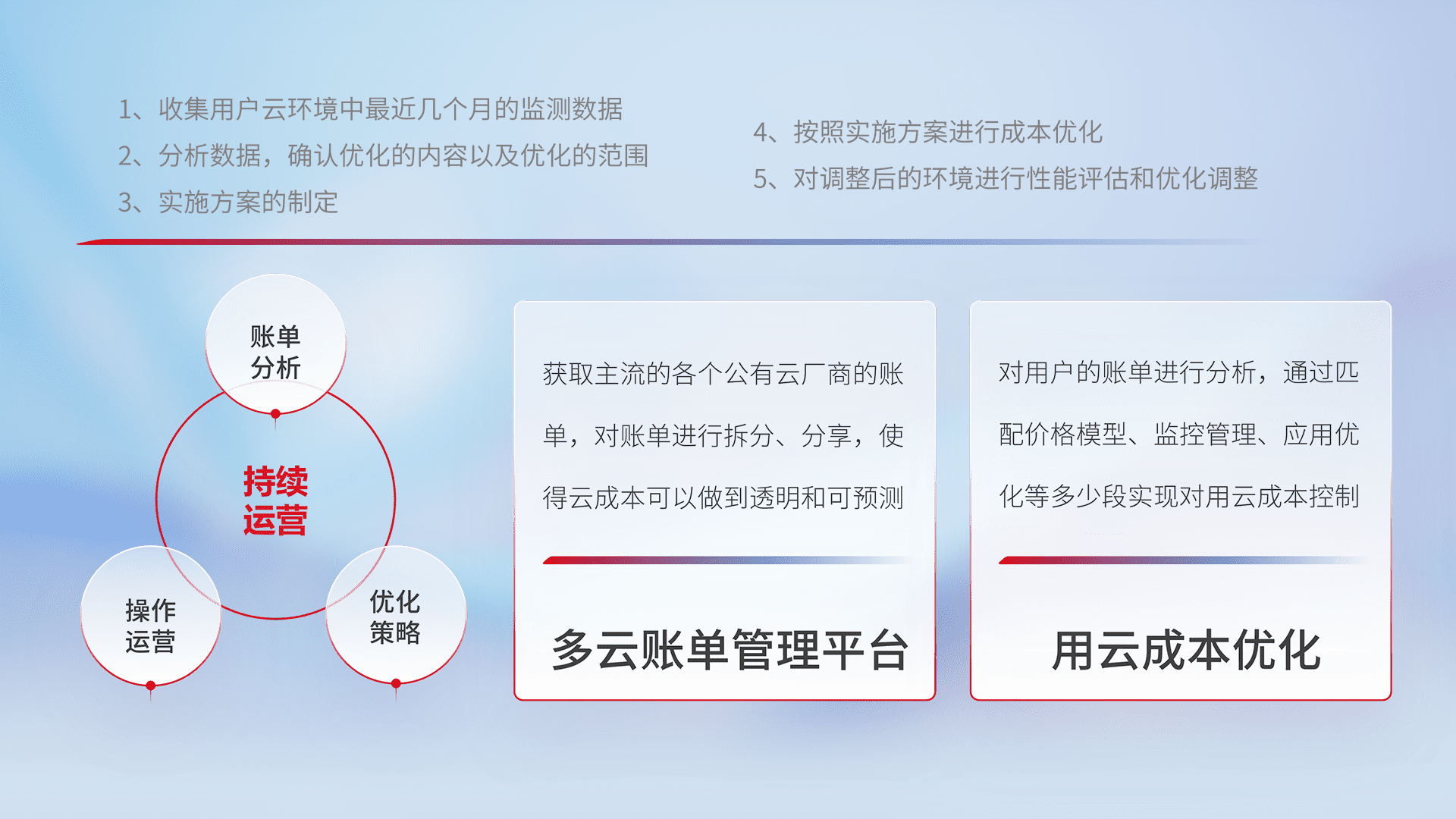 通过灵活运用多种自动化迁移工具,,帮助企业用户实现业务和数据高效 、、稳定的上云迁移和云上迁移,,,,采用自研多云纳管平台,,,以中立管理模式,,解决多组织、、、多云、、、多运维厂商的复杂关系的管理,,,,保证多云平台资源配置的一致性,,,,实时掌控云资源运行数据,,,运用智能化工具分析云资源多云平台的管理服务,,透明化管理成本支出,,用云成本可预测、、、用云费用可优化、、、、云资源配额有据可依。。。。