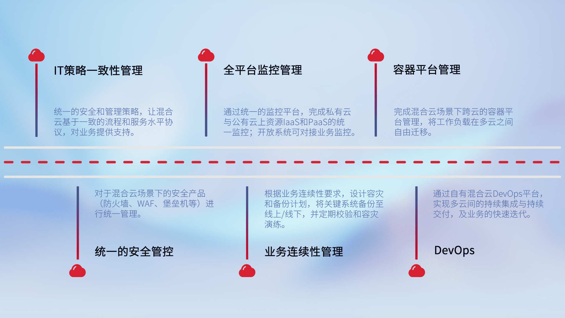 通过多云纳管,,以统一的资源数据模型把客户的云资源进行抽象和封装,,,,进而实现对多云资源的统一操作,,,,保障云资源管理的可靠性、、稳定性与可用性。。量身定制化运维内容,,配置、、开发运维、、、、补丁管理、、、、备份、、、监控、、、、认证和访问管理、、、审计和日常巡检等,,,保障在用云过程中的可靠度,,,稳定度以及高可用率。。。